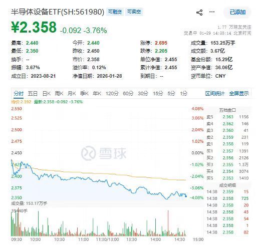 1月29日,半导体设备板块出现显著调整,截至收盘,表征板块的半导体设备ETF(561980)下跌3.59%。前几大权重股普遍承压,其中北方华创跌5.06%,中微公司跌4.58%,中芯国际跌4.40%,寒武纪-U与海光信息分别下跌2.26%和1.88%。