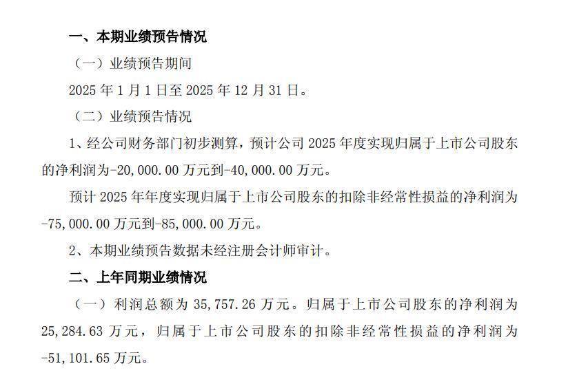 根据最新业绩预告,公司预计2025年度实现归属于上市公司股东的净利润为-2亿元到-4亿元;预计2025年年度实现归属于上市公司股东的扣除非经常性损益的净利润为-7.5亿元到-8.5亿元。
