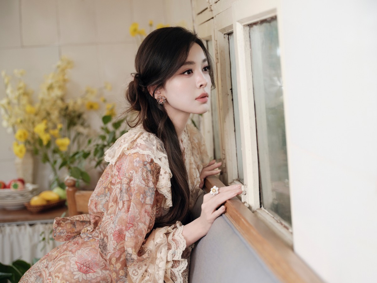 拍摄场景也选得超有feel——花房与厨房的交界处,既有自然的诗意,又有生活的烟火气。她一会儿倚着窗框望向远方,发丝被微风撩起,眼神里盛着故事;一会儿又坐在料理台上,指尖轻点脸颊,笑得像个刚偷吃了一块蛋糕的小女孩。没有夸张的pose,没有硬拗的“氛围感”,全是松弛又灵动的瞬间,仿佛她本来就该生活在这片阳光、鲜花与香气交织的天地里。