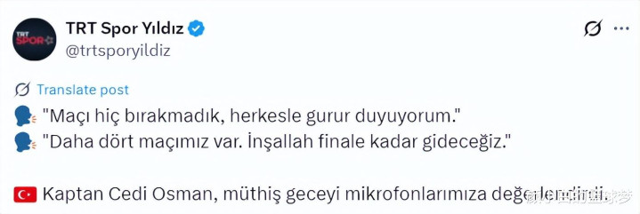 赛后土耳其男篮队长切迪-奥斯曼接受采访:我们从未放弃过比赛,我为球队每个人都感到骄傲;我们还有四场比赛要打,希望我们能进入决赛夺冠。