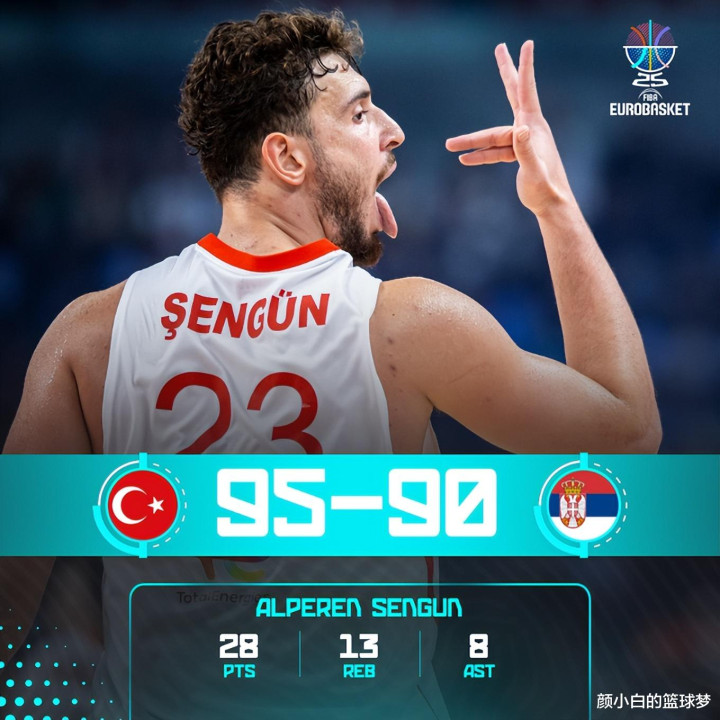 北京时间9月4日,2025年男篮欧洲杯小组赛,土耳其男篮95-90击败塞尔维亚男篮豪取五连胜。这场比赛双方是拉锯战,进入最后41秒申京两罚全中+决胜抢断才帮助土耳其掌控大局,阿尔佩伦-申京比赛中的表现比NBA一哥尼古拉-约基奇还要出色。