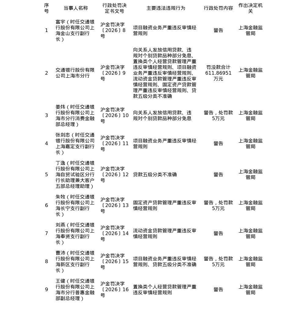 罚单显示,交通银行股份有限公司上海市分行的主要违法违规事实(案由)为:向关系人发放信用贷款、违规对个别贷款品种部分免息、置换类个人经营贷款管理严重违反审慎经营规则、项目融资业务严重违反审慎经营规则、流动资金贷款管理严重违反审慎经营规则、固定资产贷款管理严重违反审慎经营规则、贷款五级分类不准确。