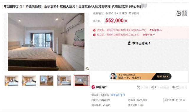 据记者统计,2026年刚开年仅一个月,阿里资产上杭州公寓类的商拍就已成交了56套,有40套在50次出价以上,其中出价百次以上的则有8套。
