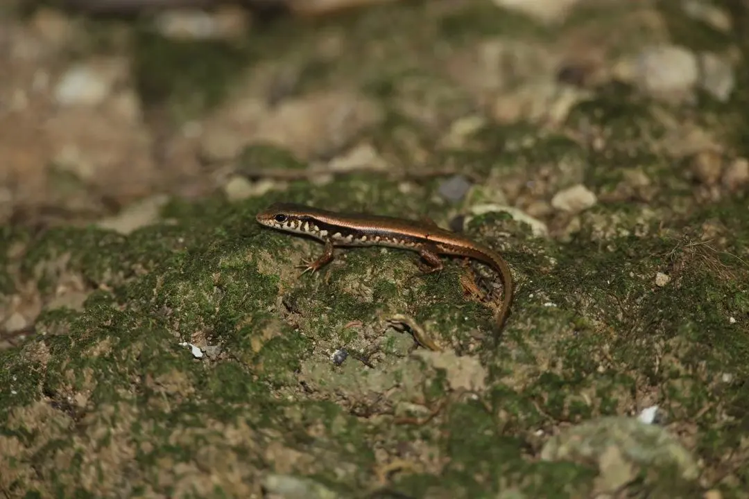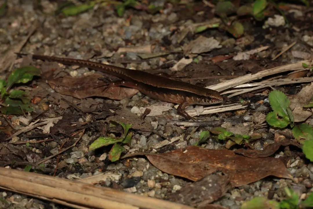 岭南蜓蜥中等体型,最显著的鉴别特征是从鼻后区向后延伸至后肢的大而不规则白色斑块,常连成断续的纵线,这一特征在幼体中尤为明显,随年龄增长逐渐淡化。它们栖息于海拔440至600米的常绿阔叶林,偏好腐殖质深厚的地表环境,常在路边枯叶中出没,受惊时会迅速钻入落叶层隐匿。流溪河优越的森林环境和湿润气候,为其提供了理想的栖息之所。
