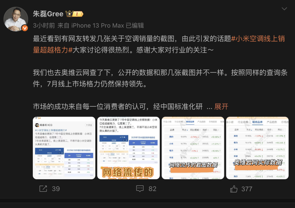 8月18日晚,格力电器市场总监朱磊在微博上发文反击”小米空调线上销量超越格力“说法,称“我们也去奥维云网查了下,公开的数据和那几张截图并不一样。按照同样的查询条件7月线上市场格力仍然保持领先。”