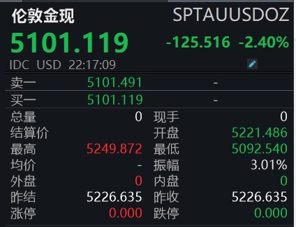 【大河财立方消息】2月24日股票配资证券,现货黄金向下跌破5100美元,日内下跌2.49%。截至发稿,现货黄金报5101.119美元/盎司。